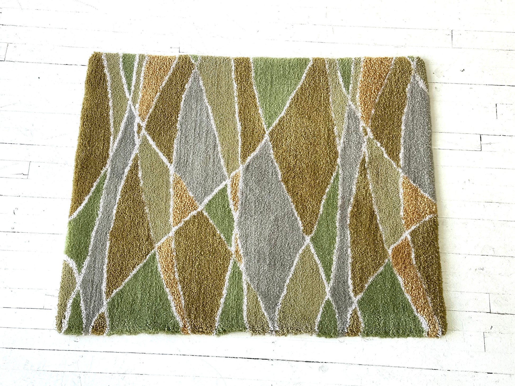 This one-of-a-kind, hand-tufted rug makes a beautiful accent in a bedroom, living room, office or studio. A gorgeous palette and contemporary geometric line design add sophistication to the interior environment of your sanctuary. The term electrum means a natural alloy of gold and silver and is often referred to as "green gold." These olive, sage and mustard yarns are 100% wool. The cut pile is 3/4" and feels luxurious under bare feet! The Electrum rectangular rug measures 47" x 39" and weighs 15 pounds. It is backed with a synthetic latex and soft upholstery fabric handsewn to the edge. My rugs are not sheared; I prefer the more natural texture of the tufted yarns. Free shipping is offered within the United States. Thank you for supporting my dream design job! Liz