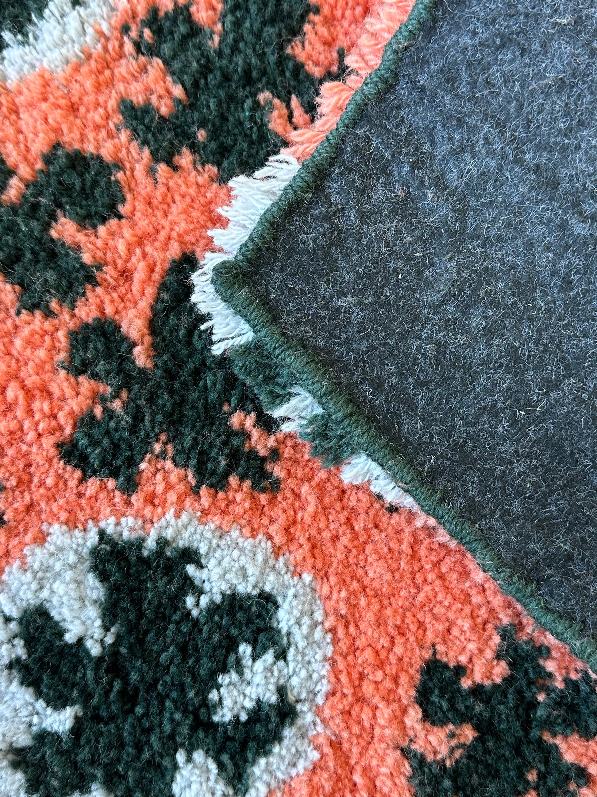 This one-of-a-kind, hand-tufted rug mat makes an adorable accent in a child's room. Playful colors and a cute, detailed star design add joy to an interior room. The coral, white and green yarns are 100% wool. The cut pile is 5/8" and feels luxurious under bare feet! The Starzmat rectangular rug measures 30" x 23" and weighs 3.6 pounds. It is backed with a synthetic latex and felt fabric, and it is whipstitched by hand around the edge with the green wool yarn in the rug. My rugs are not sheared; I prefer the more natural texture of the tufted yarns. Free shipping is offered within the United States. Thank you for supporting my dream design job! Liz