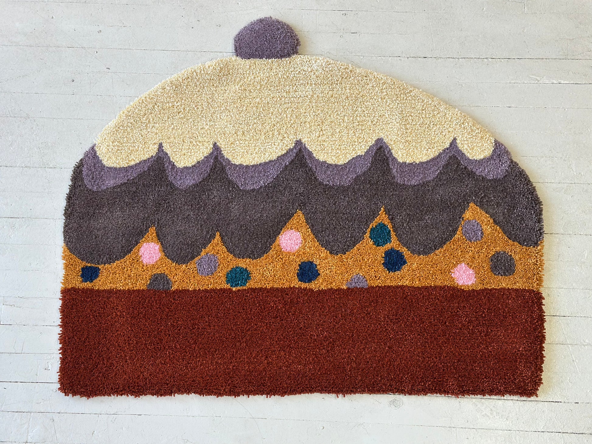 This one-of-a-kind, hand-tufted rug makes an adorable addition to a child's room. An interesting palette of playful colors on dots and scallops are a joy in this cute cake design. A sweet surprise to wake up to every day! The orange, dark purple, light purple, cream, gold, blue, teal and pink yarns are 94% wool, 6% cotton. The cut pile is 5/8" and feels luxurious under bare feet! The Surprisecake rug is an irregular cake shape that measures 42" x 37" and weighs 8.8 pounds. It is backed with a synthetic latex and handsewn soft upholstery fabric. My rugs are not sheared; I prefer the more natural texture of the tufted yarns. Free shipping is offered within the United States. Thank you for supporting my dream design job! Liz